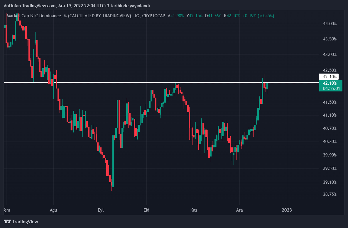 Şuan itibariyle Bitcoin dominance tablosunun yüzde 42.10 direncinde olduğu gözlenmekte. 27 Kasım tarihinden bu yana yükselen BTC dominance tablosu, artık bu yükseliş trendinin sonuna gelmiş olabilir.