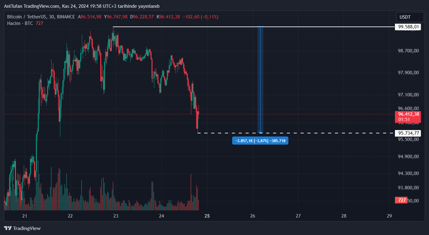 Son günlerde 99.588 dolarda zirve yapan Bitcoin, düşüş trendine girdi. Bu düşüşler özelinde zirve noktadan %4’e yakın değer kaybeden BTC, kısa bir süre önce ise 95.734 doları gördü.