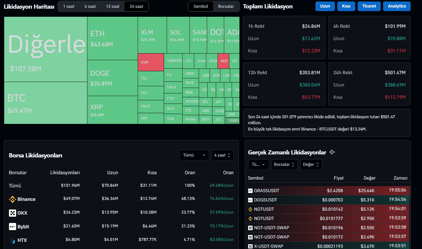Başarılı bir veri sağlayıcısı olan CoinGlass‘ın aktardığı bilgilere göre bugün itibariyle kripto para sektöründe toplamda 501 milyon dolarlık bir likidasyon gerçekleşti.
