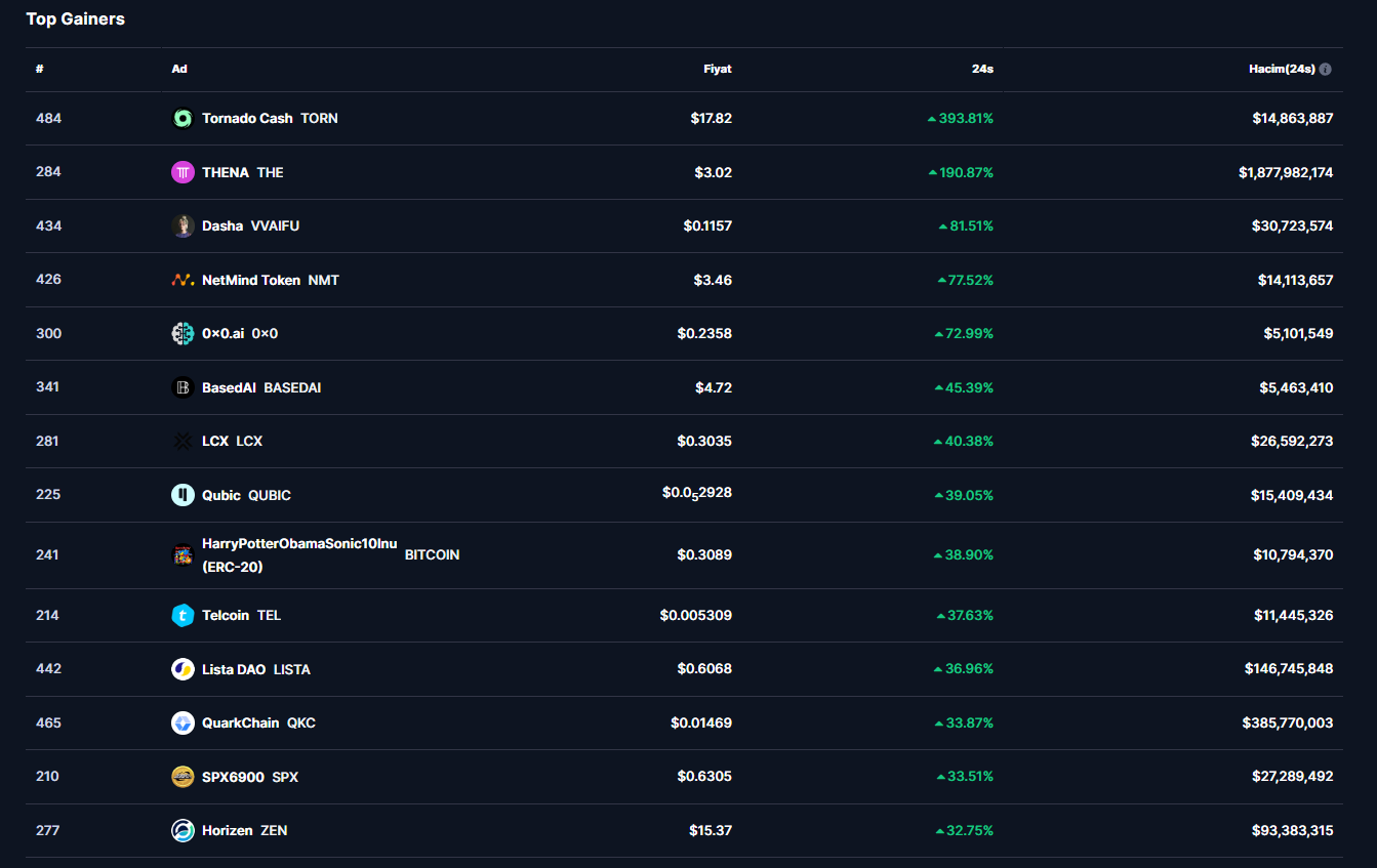 Başarılı veri sağlayıcısı CoinMarketCap’in aktardıklarına göre ilk 500 kripto para birimi içerisinde son 24 saat özelinde en çok artışı %393 ile birlikte TORN isimli altcoin gerçekleştirdi.