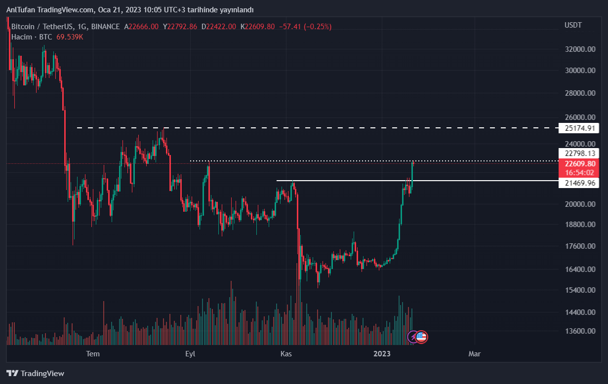 Şuan itibariyle ise Bitcoin 22.600 dolar seviyesine ulaşmış durumda. Birçok kritik direnç seviyesini aşmayı başaran BTC, yatırımcıların tekrardan umutlanmasını sağladı.