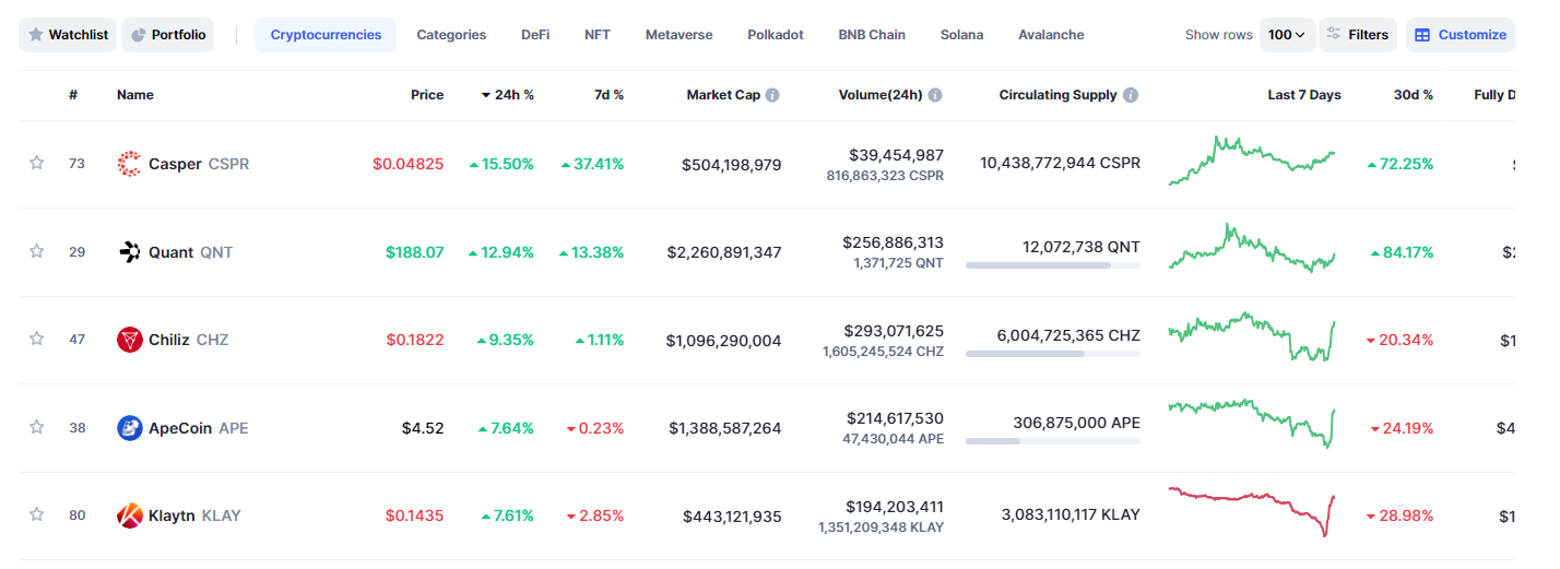 Başarılı bir veri sağlayıcısı olan CoinMarketCap’in aktardıklarına göre, ilk 100 kripto para birimi içerisinde bulunan altcoin’ler arasında son 24 saat özelinde en fazla Casper (CSPR) yükseliş yaşamayı başardı.