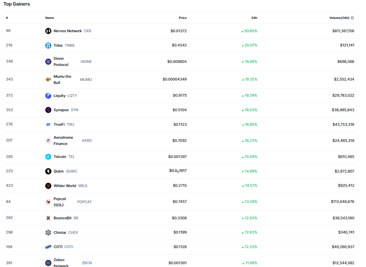 CKB’nin yanı sıra TRIBE, DIONE, MUMU, LQTY, SYN, TRU, AERO, TEL ve QUBIC‘in de %15’den fazla artış yaşadığı görüldü.
