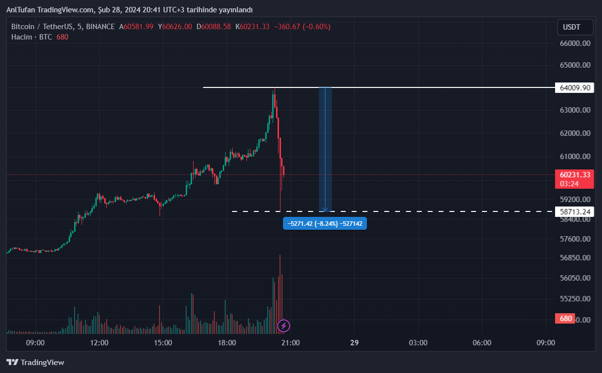 Son dakikalarda Bitcoin (BTC) 64 bin dolar seviyelerinde sert bir satış baskısı ile karşı karşıya kaldı. BTC çok kısa bir süre içerisinde 64 bin dolardan 58.700 dolara kadar %8’lik bir düşüş gerçekleştirdi.