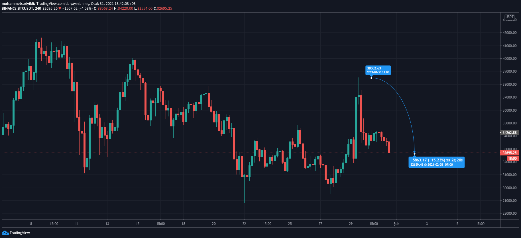 Her ne kadar Elon Musk’ın attığı Tweet ile yukarı yönlü bir hareket yaşayıp 38.500 dolar seviyelerine kadar bir yükseliş olsa da ardından gelen yüzde 15’lik düşüş, fiyatı eski seviyelerine geri getirdi.