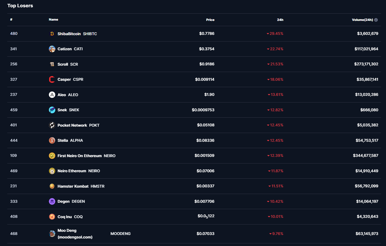 Başarılı veri sağlayıcısı CoinMarketCap’in aktardığı bilgilere göre son 24 saat özelinde ilk 500 kripto para birimi içerisinde en çok düşüşü -%29 ile birlikte SHIBTC isimli altcoin gerçekleştirdi.