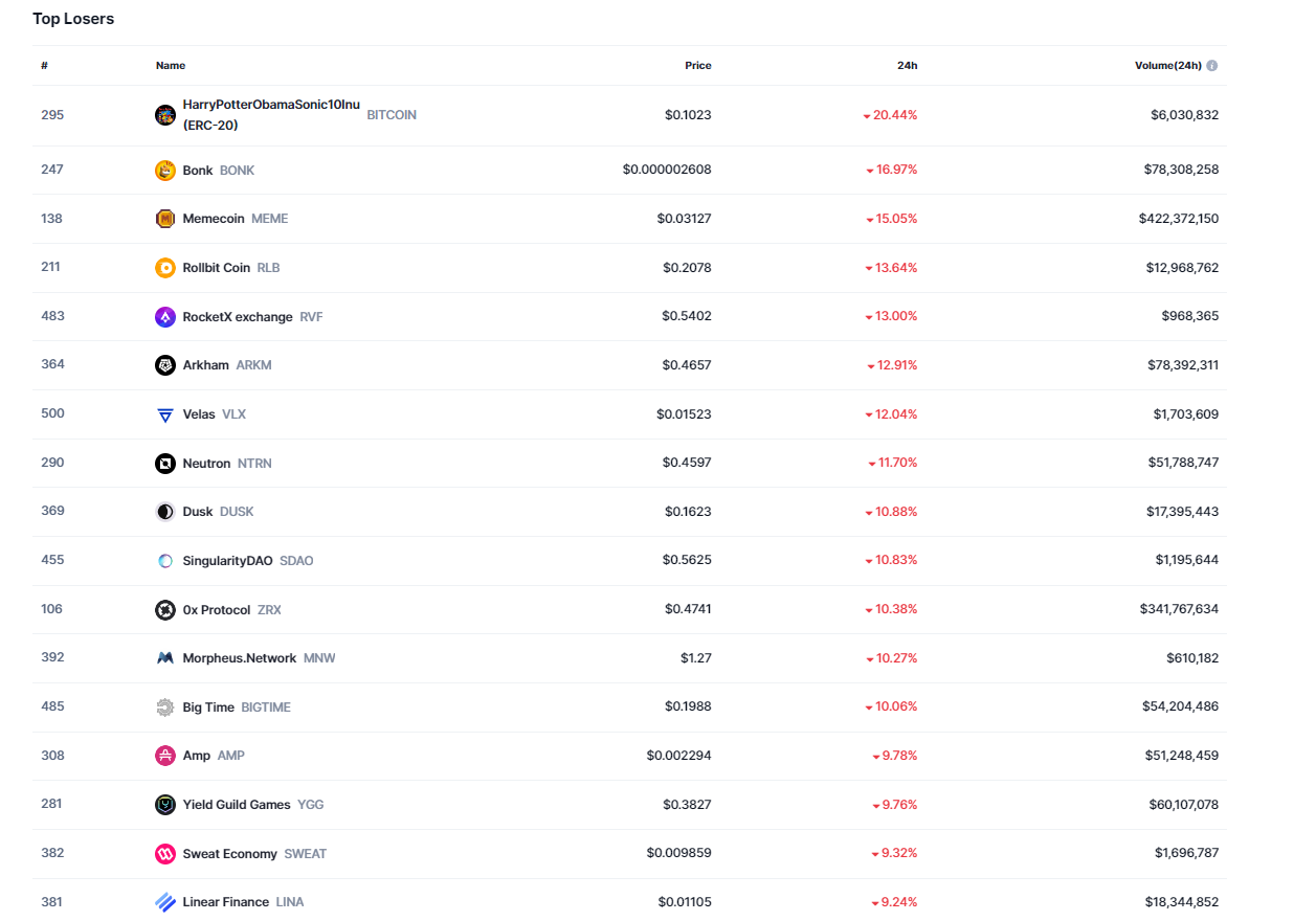 Başarılı bir veri sağlayıcısı olan CoinMarketCap’in aktardığı bilgilere göre son 24 saat özelinde piyasa değerine göre ilk 500 kripto para birimi içerisinde en büyük düşüşü BITCOIN isimli şaka tokeni gerçekleştirdi.