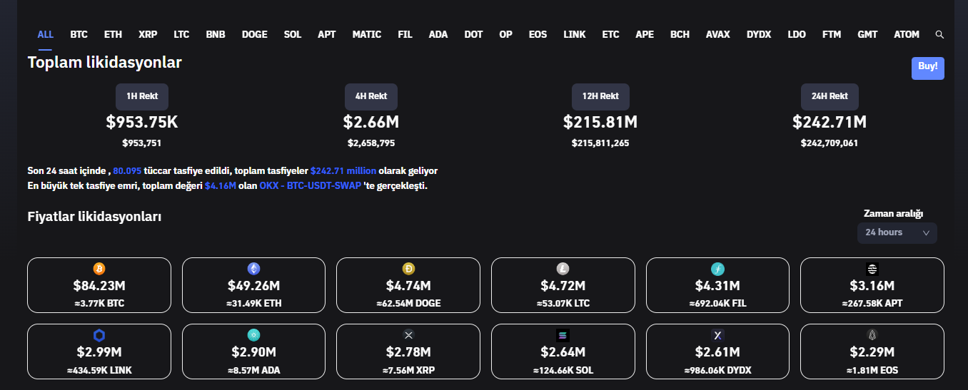 Son 24 saat içerisinde sektörde toplamda 242 milyon dolarlık bir likidasyon gerçekleşti. Her ne kadar bu miktar yüksek olsa da, geçtiğimiz dönemlerde çok daha büyüklerinin meydana geldiğini unutmamak gerek.