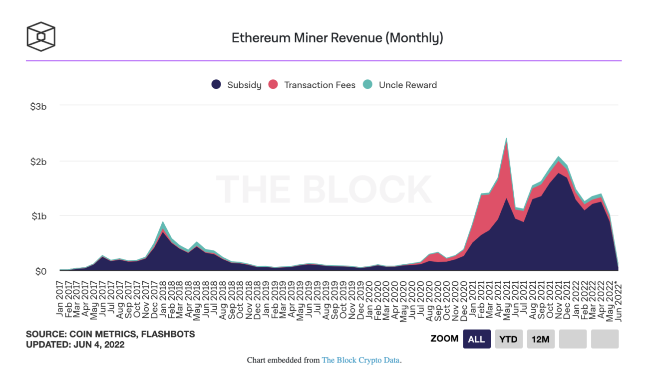Ethereum madencilerinin gerçekleştirdiği işlemlerden kazandıkları gelirler, Mayıs ayından bir önceki ay olan Nisan ayına kıyasla %27 oranında düşüş yaşadı.