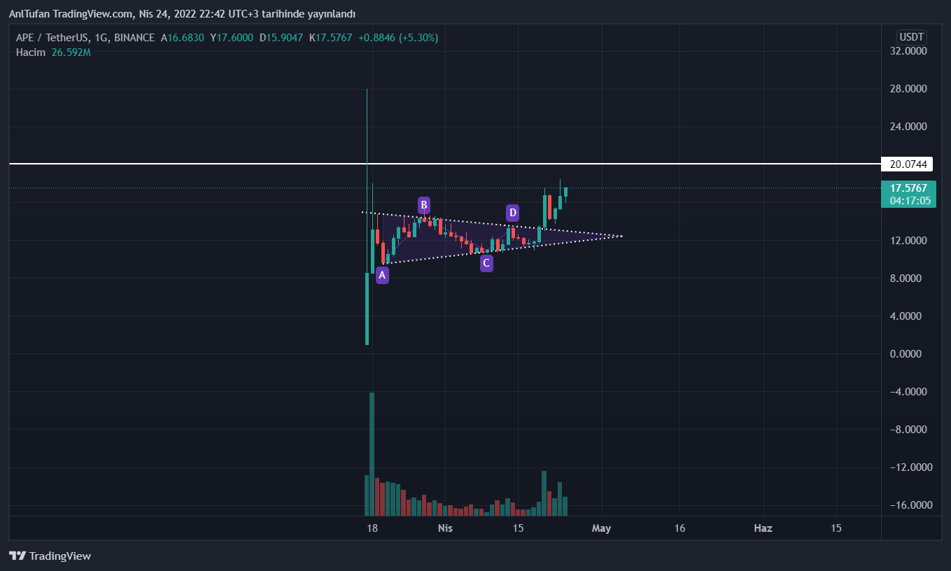 Metaverse söylentileriyle birlikte değer kazanmaya başlayan APE, bayrak formasyonunu kırmasının ardından değerine değer katmayı başardı.