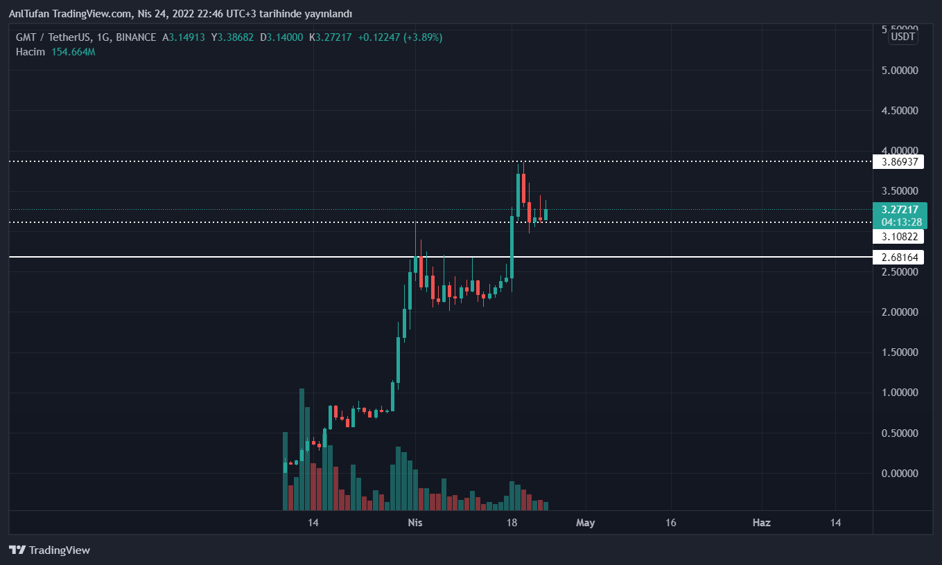 Bu haftanın yıldızlarından olan STEPN, an itibariyle yükselişine devam ediyor. Bu hafta itibariyle %35’den fazla yükselen GMT, kritik seviyelerde yer almakta.