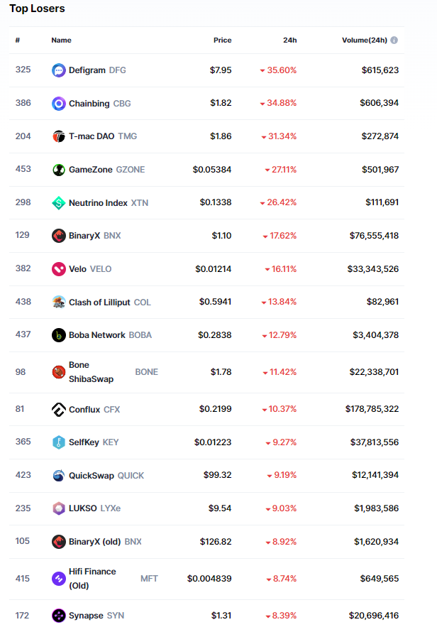 Kripto para sektörünün en büyük veri sağlayıcılarından bir tanesi olan CoinMarketCap’in aktardıklarına göre, bugün itibariyle en sert düşüşü Defigram (DFG) isimi altcoin yaşadı.