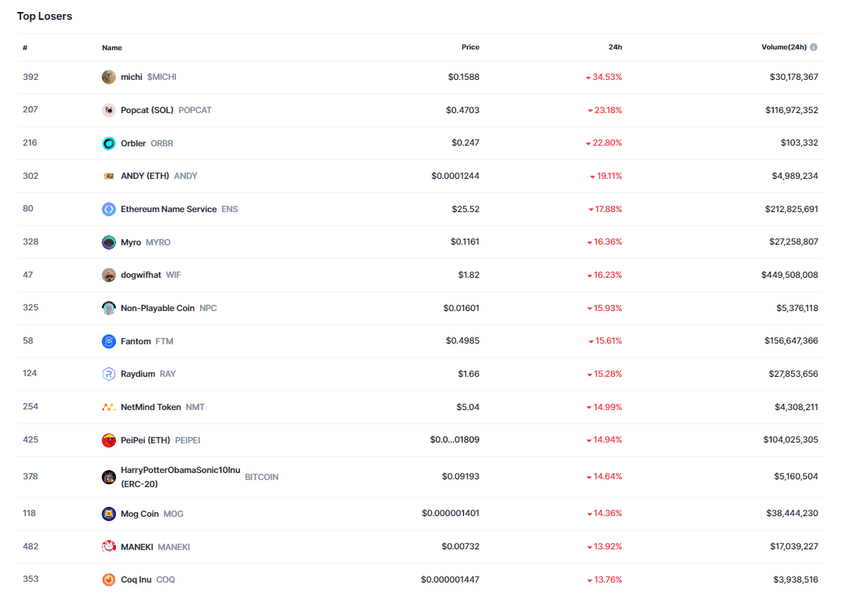 Bugün özelinde MICHI haricinde ise POPCAT, ORBR, ANDY, ENS, MYRO, WIF, NPC, FTM ve RAY ise %15’den fazla düşüş yaşadı.