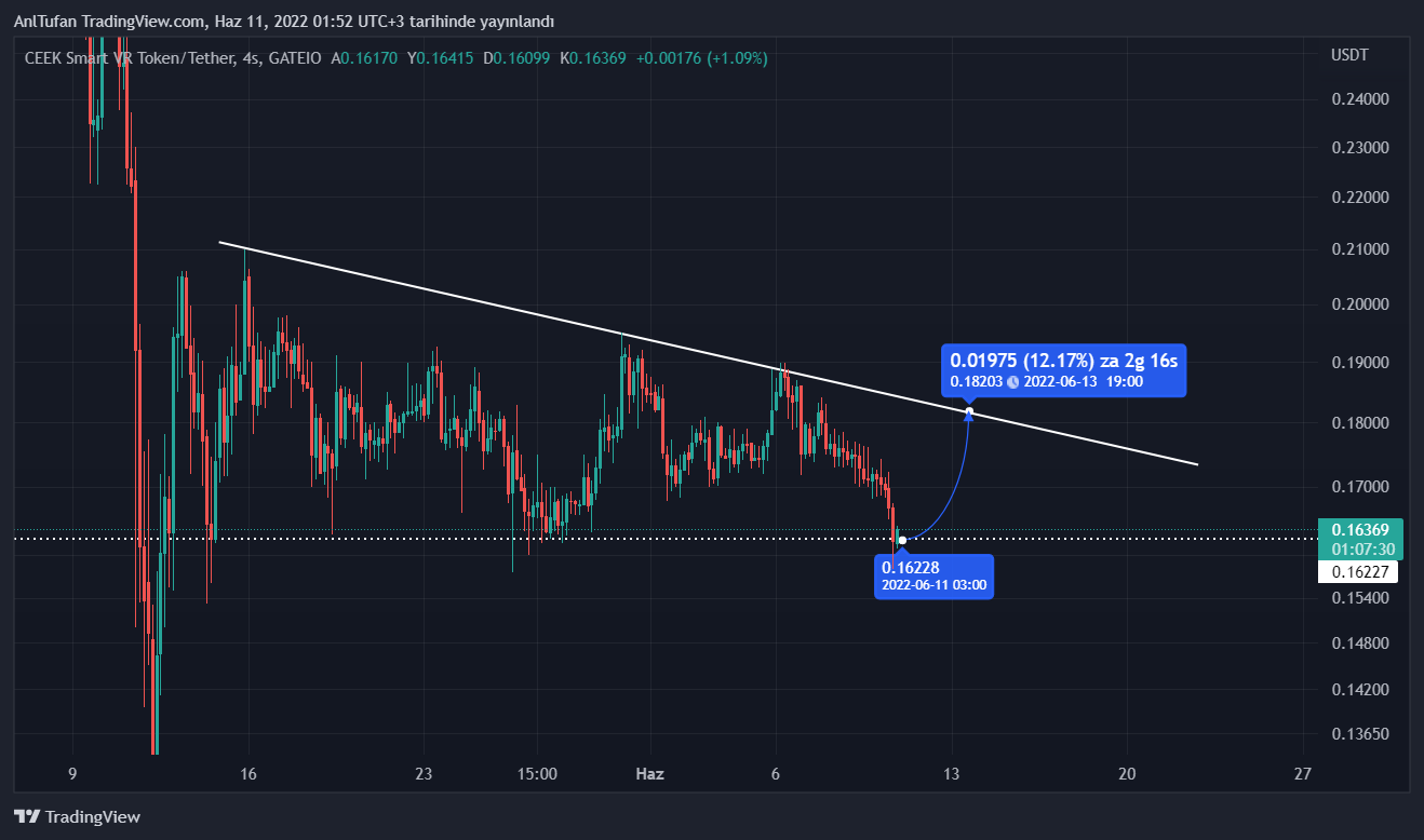 Yayın saati itibariyle 0.16 dolar seviyelerinde bulunan CEEK, kritik bir destek noktasında konumlanmakta. İlerleyen günlerde düşen trendine bir yükseliş yapabilecek olan popüler metaverse projesi, kısa süre içerisinde 0.020 dolara ulaşabilir.
