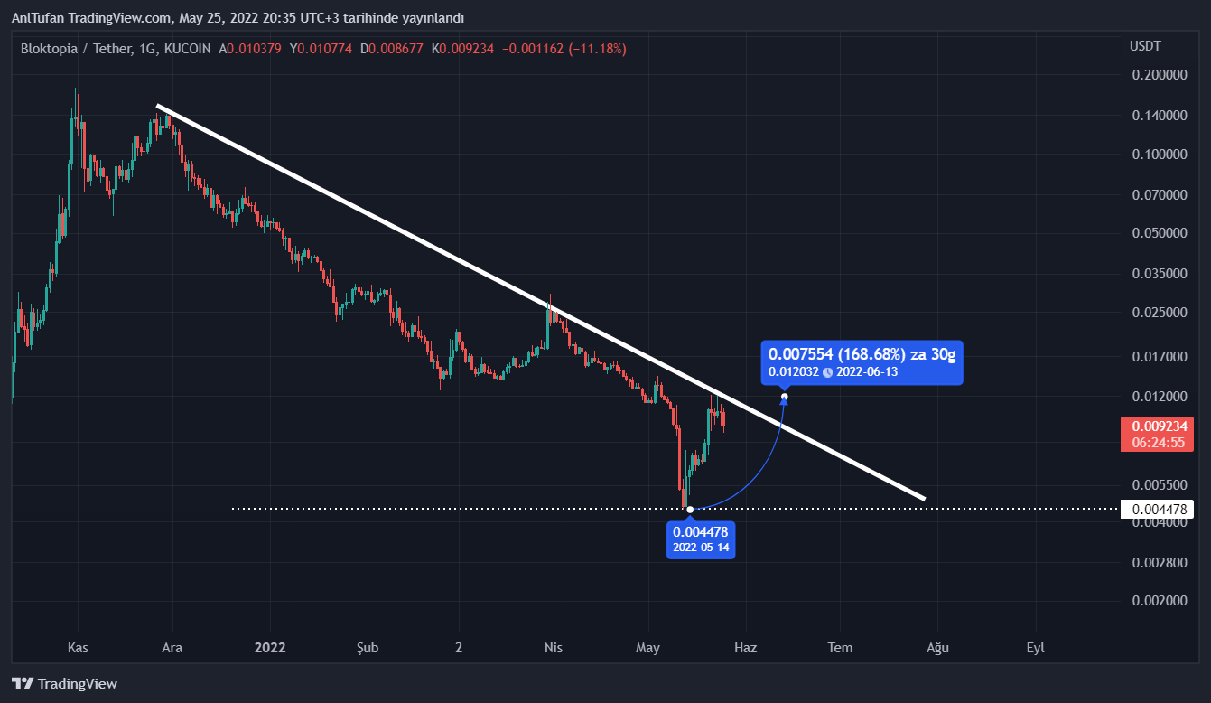 İlerleyen günlerde dip yaptığı bir seviye olan 0.0044 dolara kadar bir düşüş yaşaması halinde değerlendirilebilecek olan BLOK, düşen trend seviyesi olan 0.01320 doları aşmasıyla birlikte de değerlendirilebilir.
