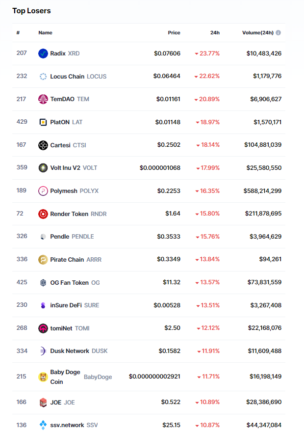 Başarılı bir veri sağlayıcısı olan CoinMarketCap’in aktardıklarına göre, yukarıdaki listede yer alan altcoin’ler, bugün özelinde yatırımcılarının çok zorlu bir 24 saat geçirmesine neden oldu.