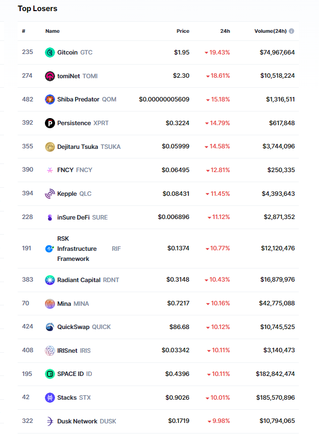 Bugün özelinde yüzde 20’ye yakın değer kaybeden GTC, yatırımcıların dikkatini çekti. GTC dışında aşağıda yer alan altcoin’lerde, bugün özelinde kayda değer düşüşler yaşadı: