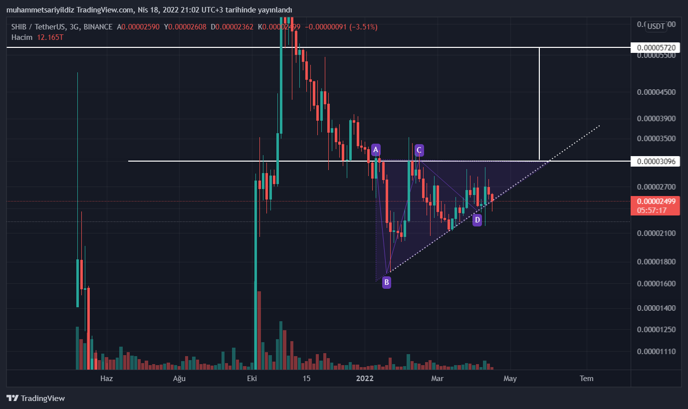 Haberimizin yazıldığı esnada 0.00002488 dolar seviyelerinde bulunan Shiba Inu, yükselen üçgen formasyonunun altında konumlanıyor.