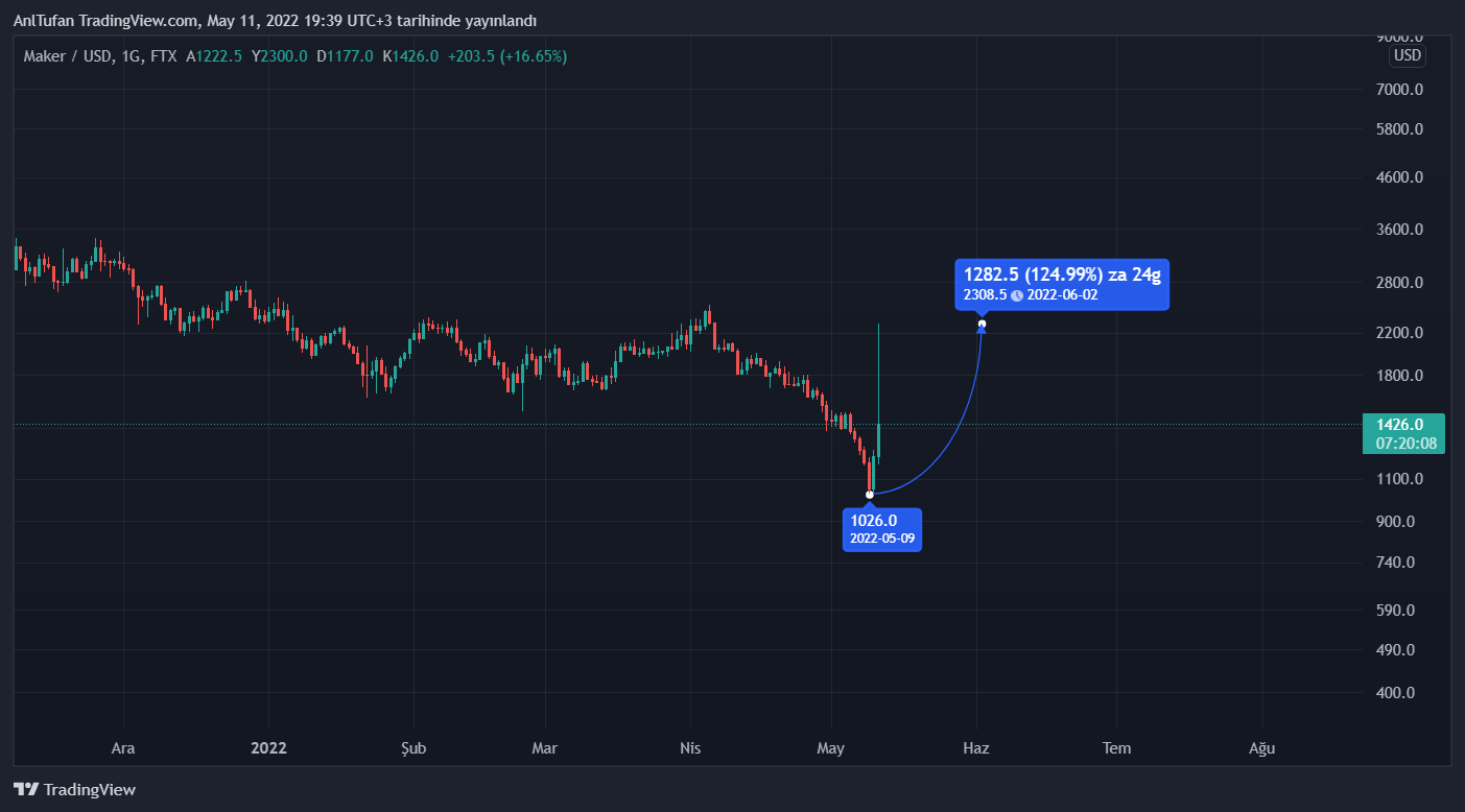 An itibariyle 1477 dolar seviyelerinde konumlanan MKR, gün içerisinde 2320 dolar seviyelerine kadar %123’lük bir artış yaşadığı göze çarpmakta.
