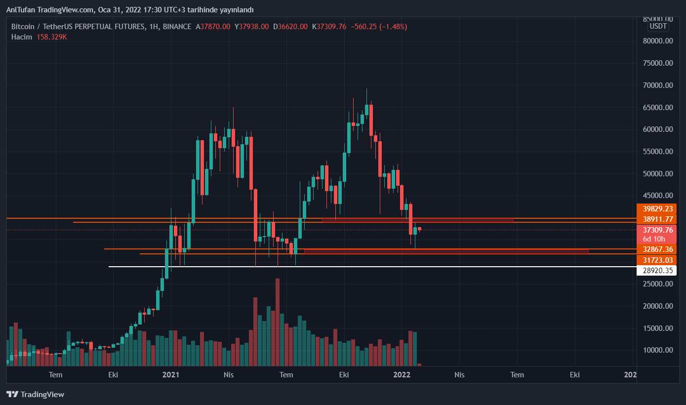 Bitcoin’e uzun vade grafiğimiz olan haftalık grafikte göz attığımızda, çok önemli destek seviyelerini kaybettiğimizi görmekteyiz. 38.900 – 40.000 dolar destek aralığı Bitcoin’in major destek seviyesiydi.
