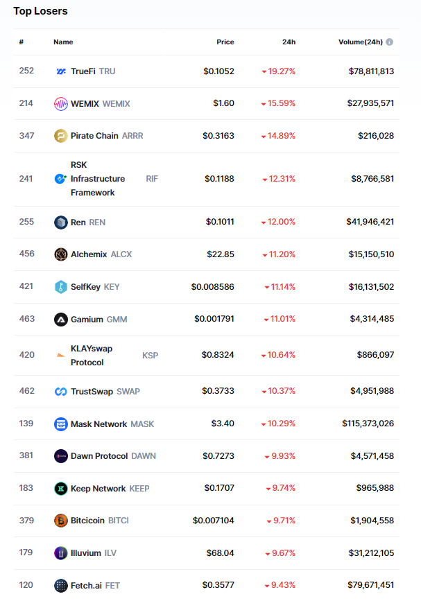 Başarılı bir veri sağlayıcısı olan CoinMarketCap’in aktardıklarına göre, bugün itibariyle ilk 500 kripto para birimi içerisinde en büyük düşüşü TrueFi (TRU) isimli altcoin yaşadı.