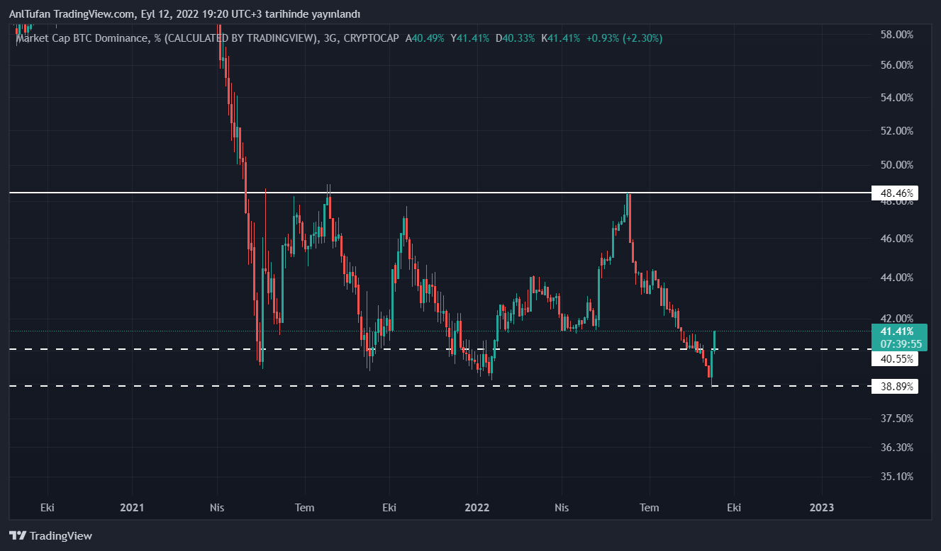 İlerleyen günlerde yüzde 48 seviyelerinde bulunan direnç noktasına kadar değer kazanması beklenen Bitcoin dominance tablosu, bu seviyeden büyük bir çöküş yaşamasıyla birlikte altcoin’ler de boğayı başlatabilir.