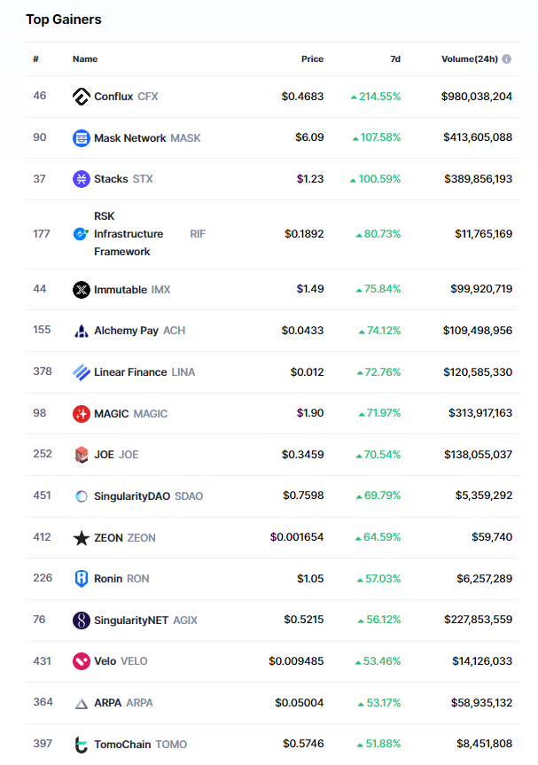 Başarılı bir veri sağlayıcısı olan CoinMarketCap’in aktardıklarına göre, bu hafta itibariyle ilk 500 kripto para birimi arasında en büyük yükselişi Conflux (CFX) isimli altcoin yaşadı.