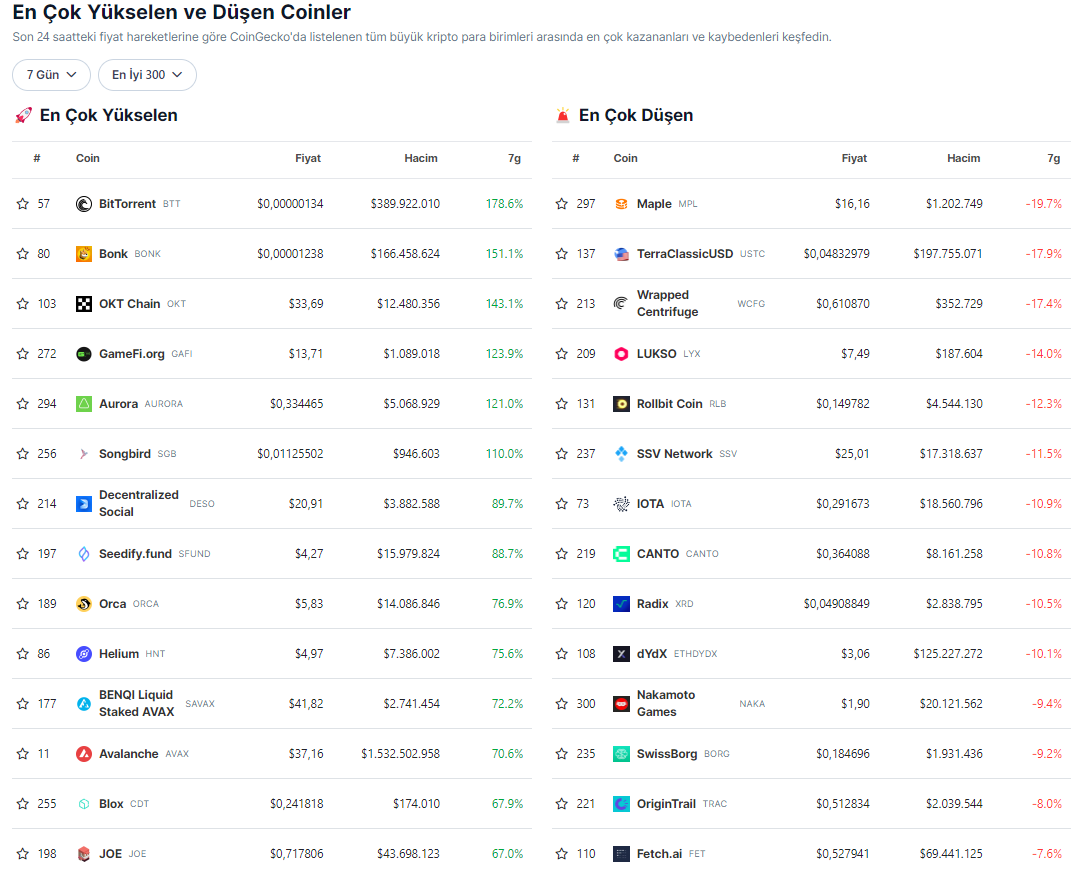 Başarılı bir veri sağlayıcısı olan CoinGecko’nun aktardıklarına göre ilk 300 kripto para birimi içerisinde bu haftanın en çok yükselen ürünü BitTorent (BTT) oldu.