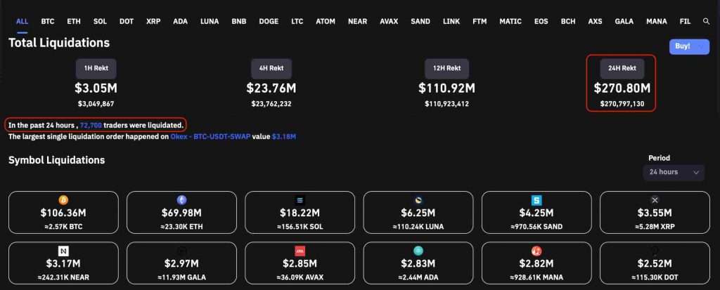 Bitcoin’in cuma günü başlayan yükselişi 72.700 yatırımcının likit olmasına neden oldu. Coinglass verilerine göre son 24 saat içerisinde kripto para piyasasında toplam 270.8 milyon dolar tasfiye edildi.