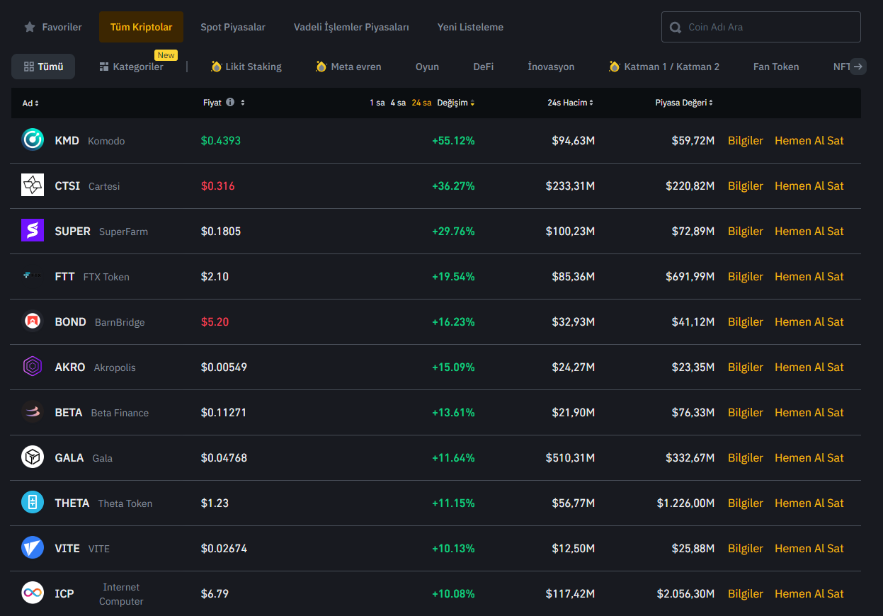 Bugün özelinde yüzde 50’den fazla değer kazanan KMD, yatırımcıların dikkatini üzerine çekti. KMD haricinde aşağıdaki altcoin’lerde bugün güzel bir performans sergiledi:
