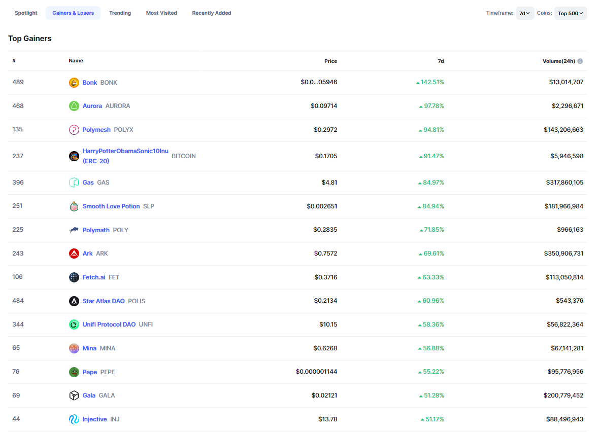 %142 oranında değer kazanan BONK‘u, %97 ile AURORA takip etti. POLYX, BITCOIN, GAS ve SLP isimli altcoin’ler ise %80’den fazla değer kazandı.