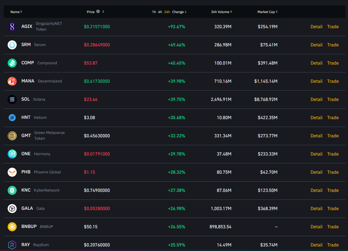 Her ne kadar son 24 saat içerisinde yüzde 200-300 oranında yükselişler yaşayan altcoin’ler olsa da, okurlarımızın ulaşımı açısından Binance’de en fazla yükselen altcoin’leri incelemek çok daha doğru olacaktır.