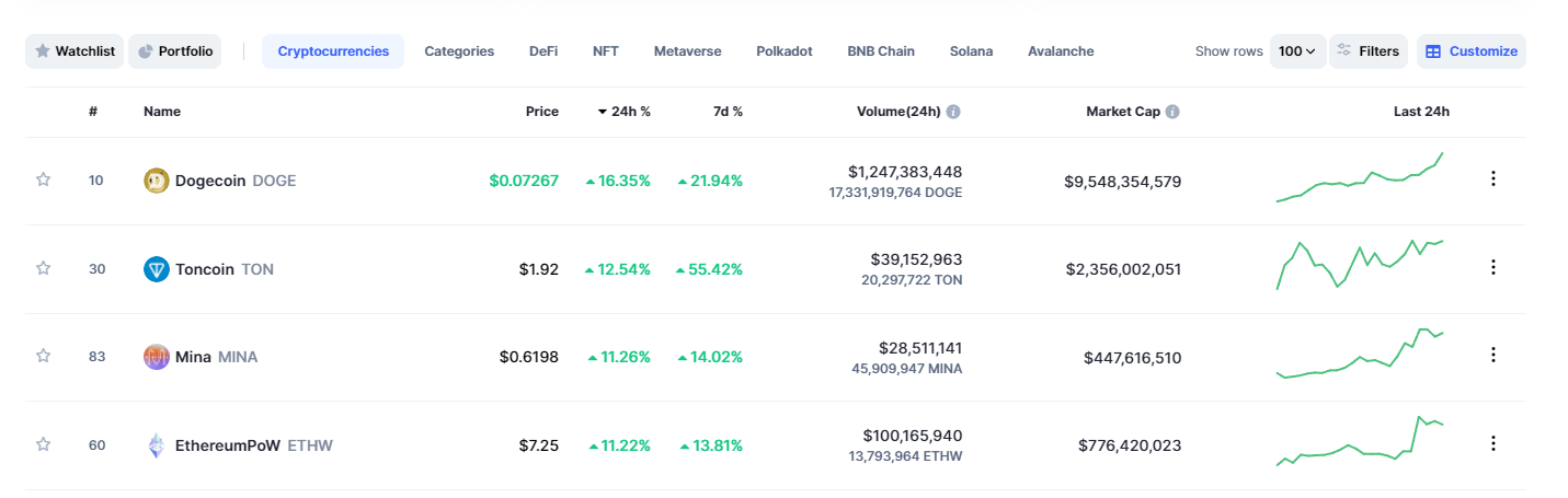 Aşağıda yer altcoin altcoin, son 24 saat içerisinde yüzde 10’dan fazla yükseliş yaşadı: