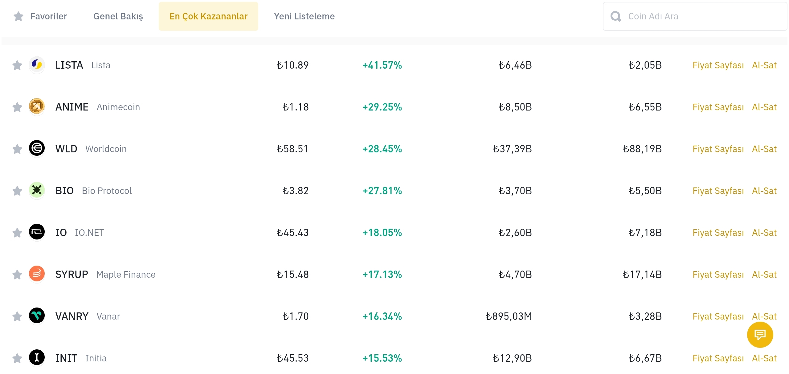LISTA’nın yanı sıra Binance TR’de listeli en çok yükselen altcoin’ler ise sırasıyla ANIME, WLD, BIO ve IO oldu.