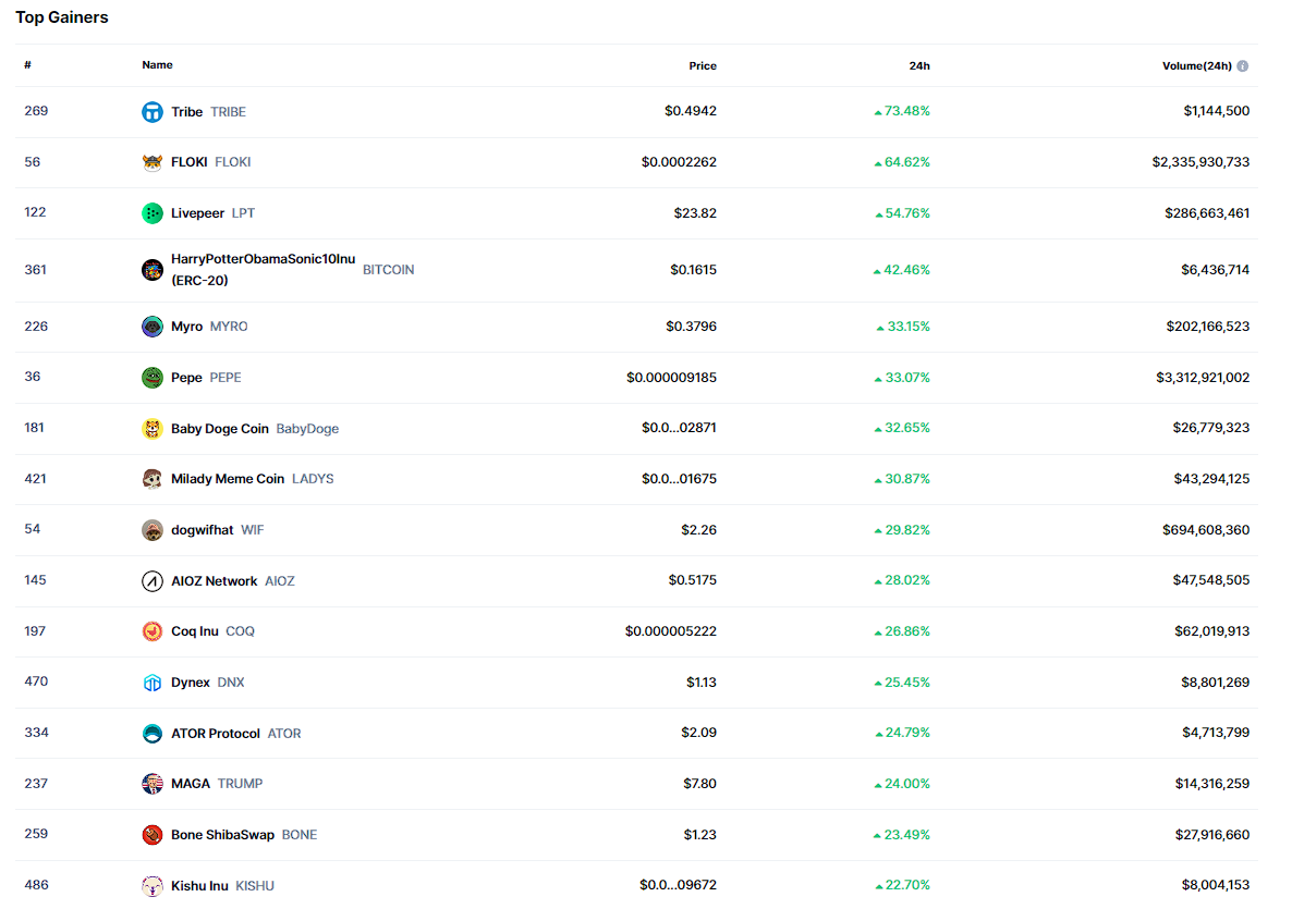 Başarılı bir veri sağlayıcısı olan CoinMarketCap’in verilerine göre bugünün en çok kazandıran altcoin‘i Tribe (TRB) oldu. TRB son 24 saat içerisinde %73’lük artış yaşadı.