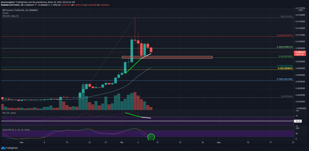 Günlük grafikte yükselişin başladığı yakın vadeden çekilen fibonacci düzeltmesine göre BTT fiyatının 0.0076 dolar altında mum kapanışı yapmasıyla alttaki golden pocket alanındaki 20 günlük hareketli ortalama olan MA20’ye (0.00607 Dolar) kadar düşmesi beklenebilir. Ancak bu düşüş senaryosundan önce grafikte RSI göstergesi tarafında gizli boğa uyuşmazlığı geliyor.