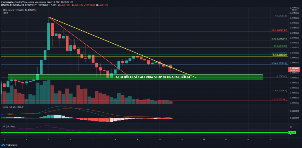 Günlükte son olarak fiyatla birlikte alçalan hacim mumları da aslında BTT üzerinde bir tehlike yaratıyor denilebilir. Bu nedenle 0.0076 dolar altındaki mum kapanışında riske karşı stop olmak tercih edilebilir.