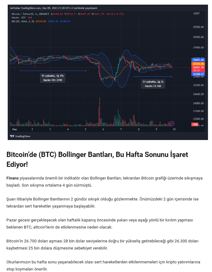 9 Haziran TSİ 21.38’de siz okurlarımıza “Bitcoin’de Bollinger Bantları Sıkışıyor! BTC Bu Hafta Sonu Patlayabilir!” başlıklı bir içerik aktarmıştık. Bu içerikte, hafta sonu özelinde sert hareketlerin yaşanabileceğinden bahsettik.