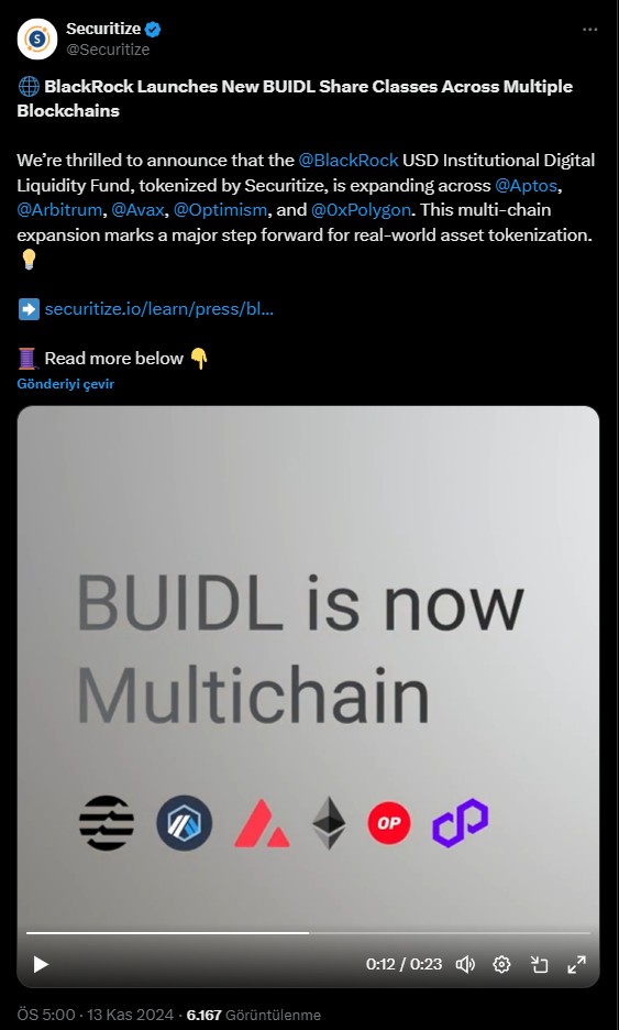 BlackRock, ilk olarak Mart 2024’te Ethereum ağında başlatılan BlackRock USD Kurumsal Dijital Likidite Fonu’nun (BUIDL), Aptos, Arbitrum, Avalanche, Optimism’in OP Mainnet’i ve Polygon’da yeni hisse sınıflarının başlatılması yoluyla blok zinciri ekosistemlerine erişim getireceğini paylaştı.