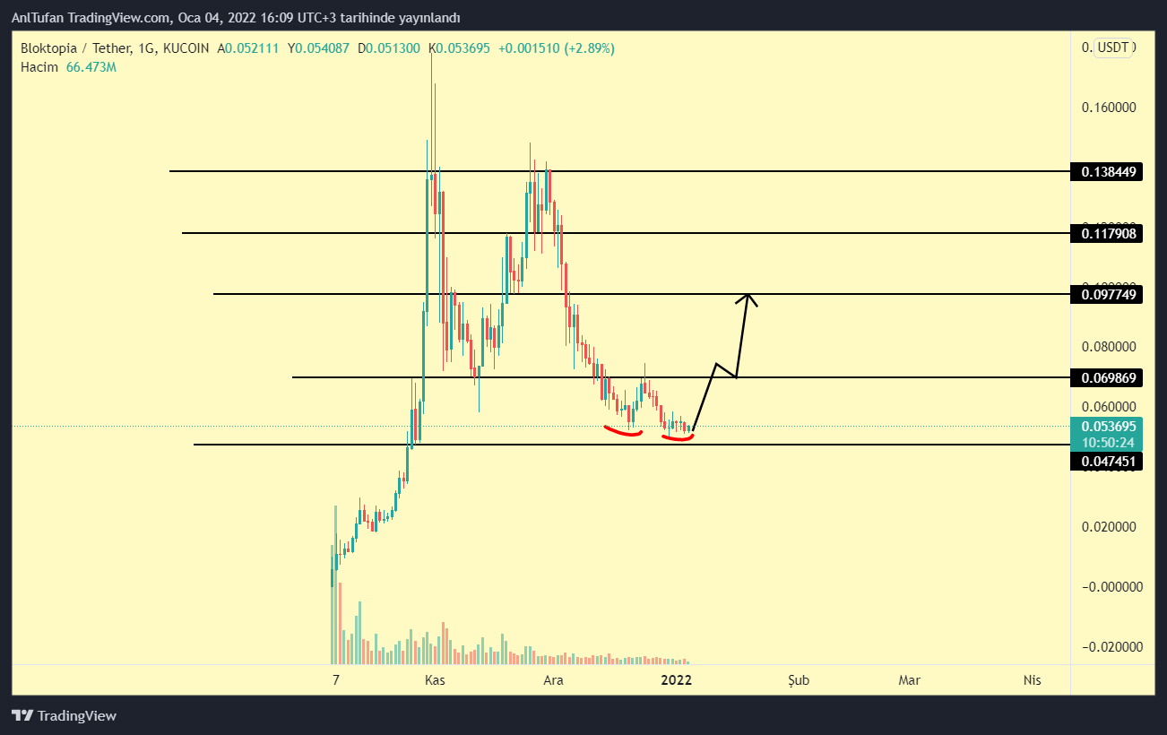 Bitcoin’in tekrardan yükselmesi halinde güzel bir hacim girişiyle yükselebilecek olan BLOK, günlük grafikte bir çift dip formasyonu oluşturuyor gibi gözükmekte. W formasyonlarını düşüş trendinin sonunda görmemiz ilerleyen günlerde BLOK için sert hareketlerin gelme olasılığını arttırıyor.