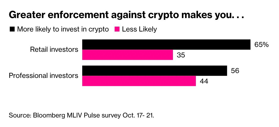 Bloomberg MLIV Pulse anketine göre, artan yasal düzenleme ve baskılara rağmen uzman yatırımcıların yüzde 56’sı kripto para sektörüne adapte olmaya ve Bitcoin satın almaya devam ediyor.