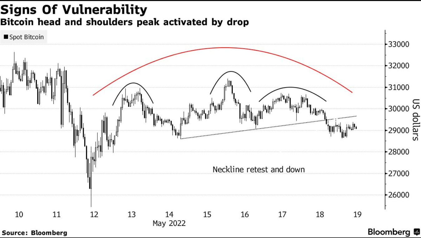 Bloomberg analistleri, grafiğin üzerinde bulunan OBO formasyonu nedeniyle ilerleyen günlerde BTC‘nin sert bir şekilde düşüş yaşayacağını iddia etmekte.