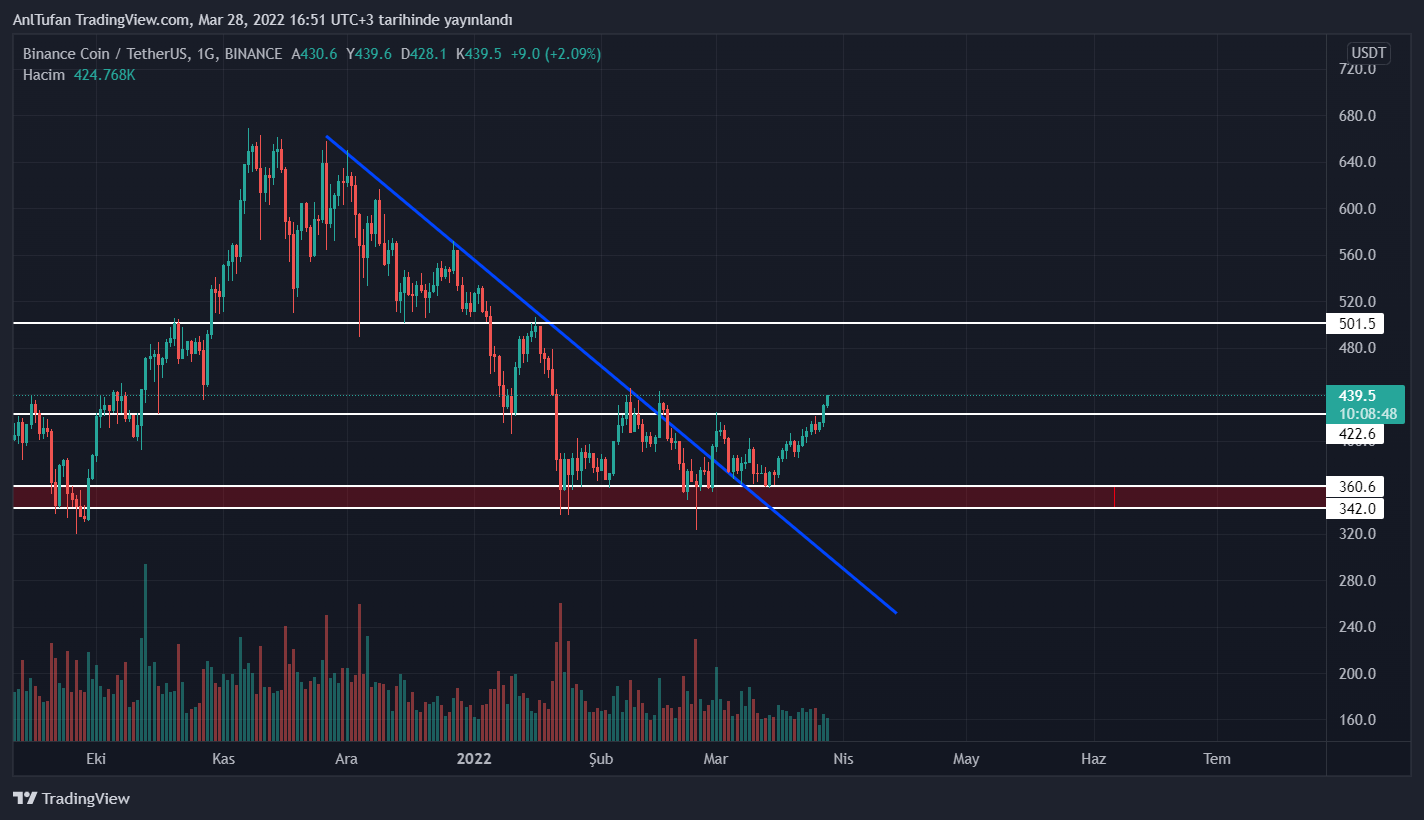 Yayın saati itibariyle 440 dolar seviyelerinde bulunan BNB, düşen trendini kırmasının ardından yükselişe başladı.