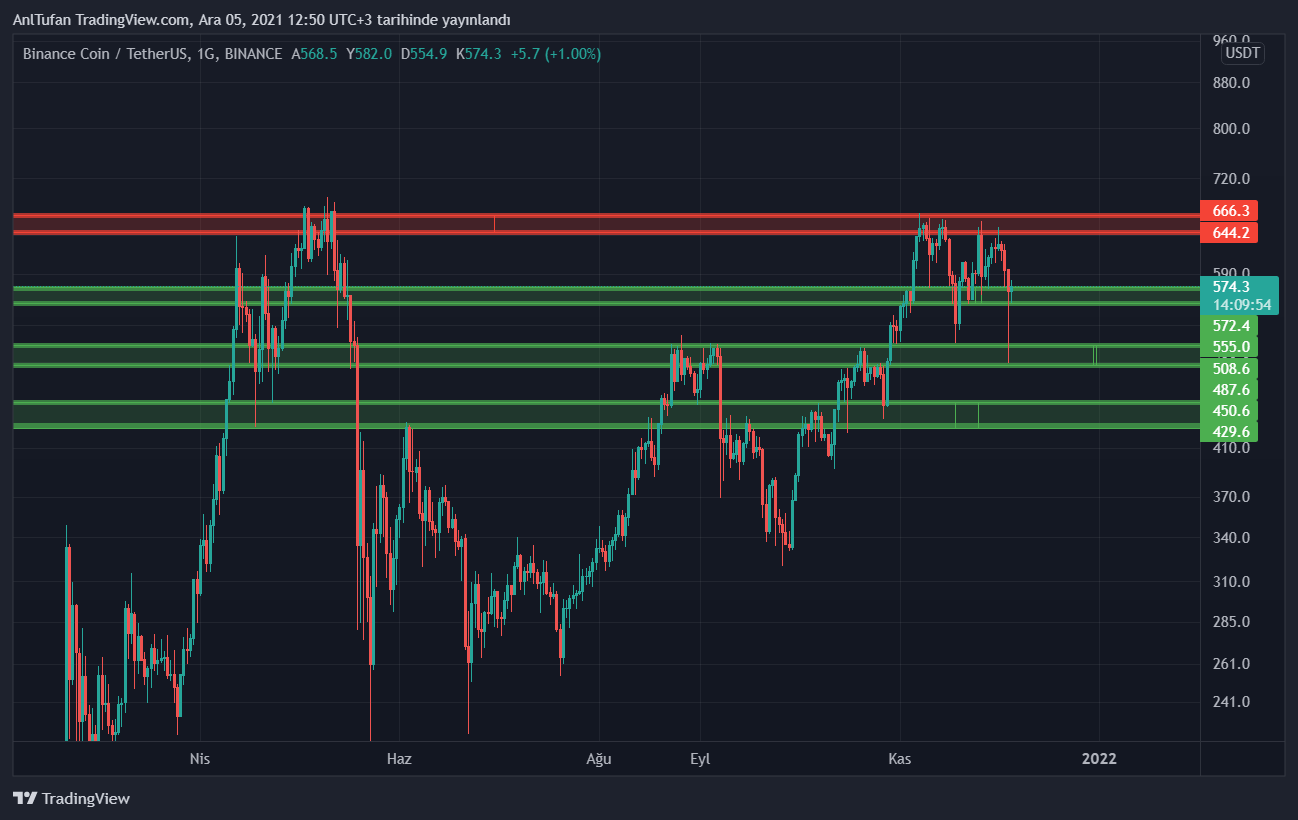 Aşağıda bulunan grafikteki destek seviyelerinden BNB’yi değerlendirebilecek olan okurlarımız kırmızı direnç seviyelerinden ise kar realizasyonu yapabilirler.