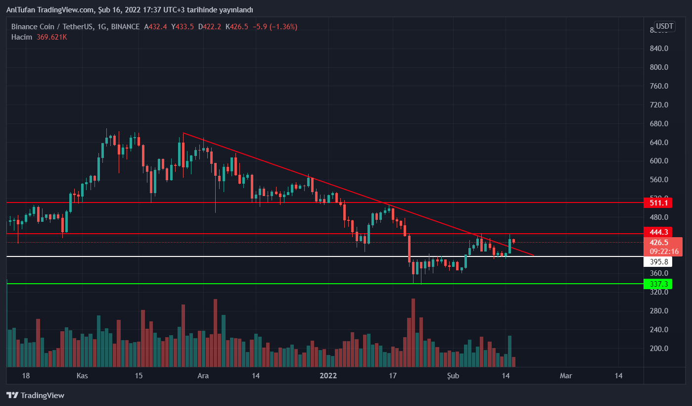 Yayın saati itibariyle 426 dolar seviyelerinde bulunan BNB, günlük grafiğe aritmetic bakış açısıyla baktığımız takdirde düşen trendini kırmış gibi gözükmekte.