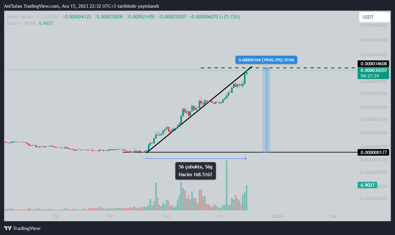 Sadece 56 gün içerisinde değerini 200’e katlamış bir üründe teknik analiz pek mantıklı görünmese de, artık BONK’un yerel tepe seviyelerine yaklaştığı görülüyor.