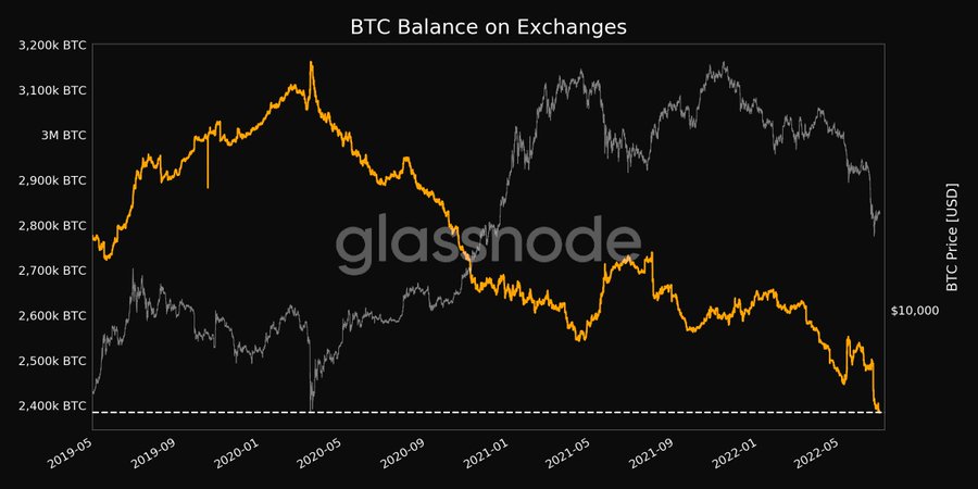 Glassnode’un paylaştığı verilere göre, borsalarda yer alan Bitcoin miktarı 2018’den bu yana en düşük seviyeye ulaştı. 26 Haziran itibarıyla ise kripto para borsaları üzerinde sadece 2.384.477.040 BTC kaldığı görülüyor.