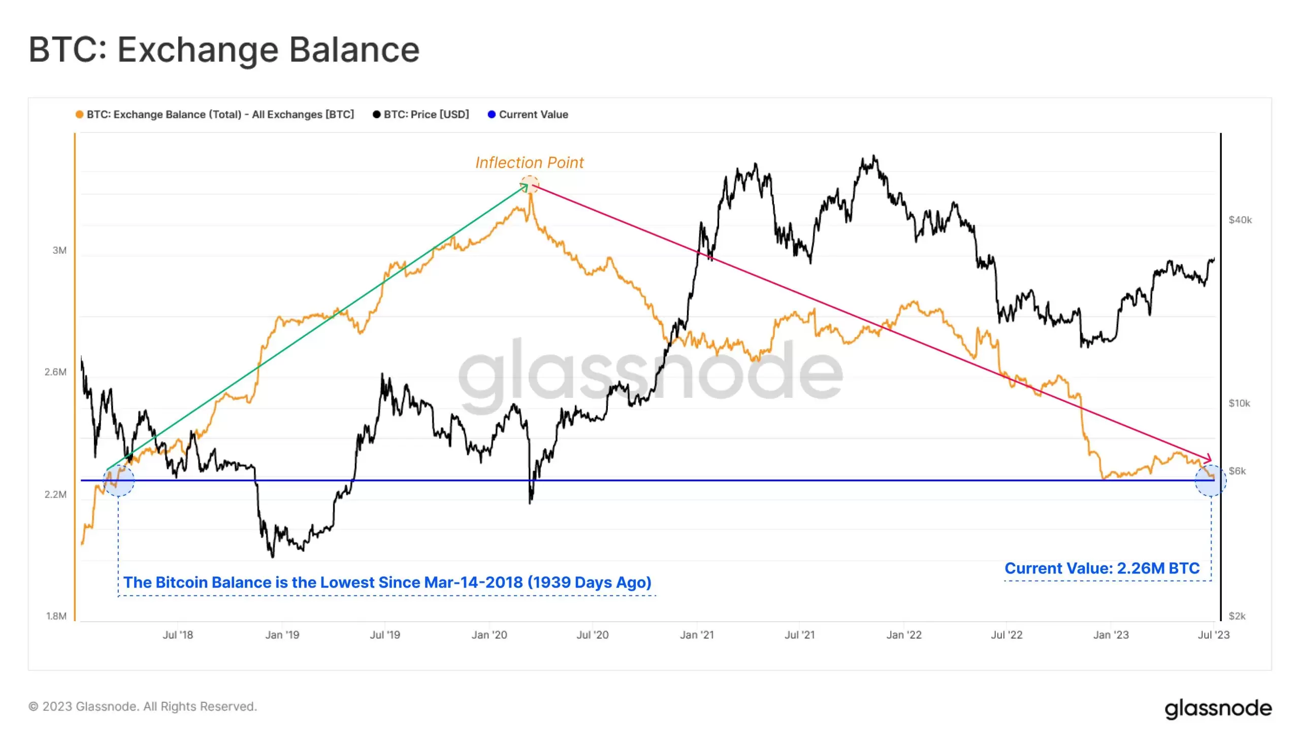 “borsalardaki bitcoin miktarı, 2,26 milyon BTC değerine düşerek 14 Mart 2018’den bu yana en düşük noktaya geriledi.”