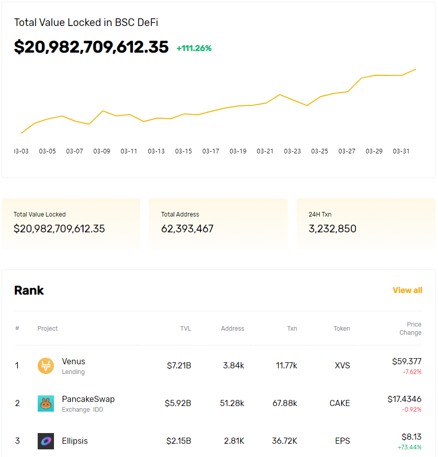 BSC, kendi bünyesinde hızla gerçekleştirdiği işlemlerle Binance Chain’den daha iyi olduğunu kanıtlarken DeFi sistemi gibi bünyesindeki projelere kilitlenen paralar sayesinde yatırımcılar, verilen tokenlerle pasif gelir sağlıyor.
