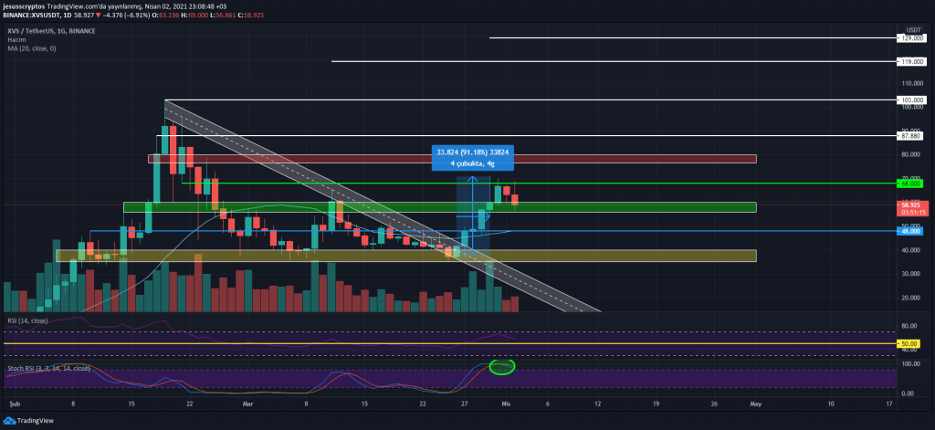 Günlük grafik üzerinde çoğu coinin ATH yaptığı gün olan 19 Şubat mumunda 102.94 doları gören XVS, sonrasında 35 gün boyunca devam eden bir düşüş trendine girdi. Düşüş trendini 26 – 27 Mart itibariyle kıran XVS, 4 gün içinde %91 değer kazandı. Bu yükselişin ardından son iki gündür kırmızı mum yakan XVS, bugün daha önce kırdığı direnç alanı içerisinde bulunuyor.